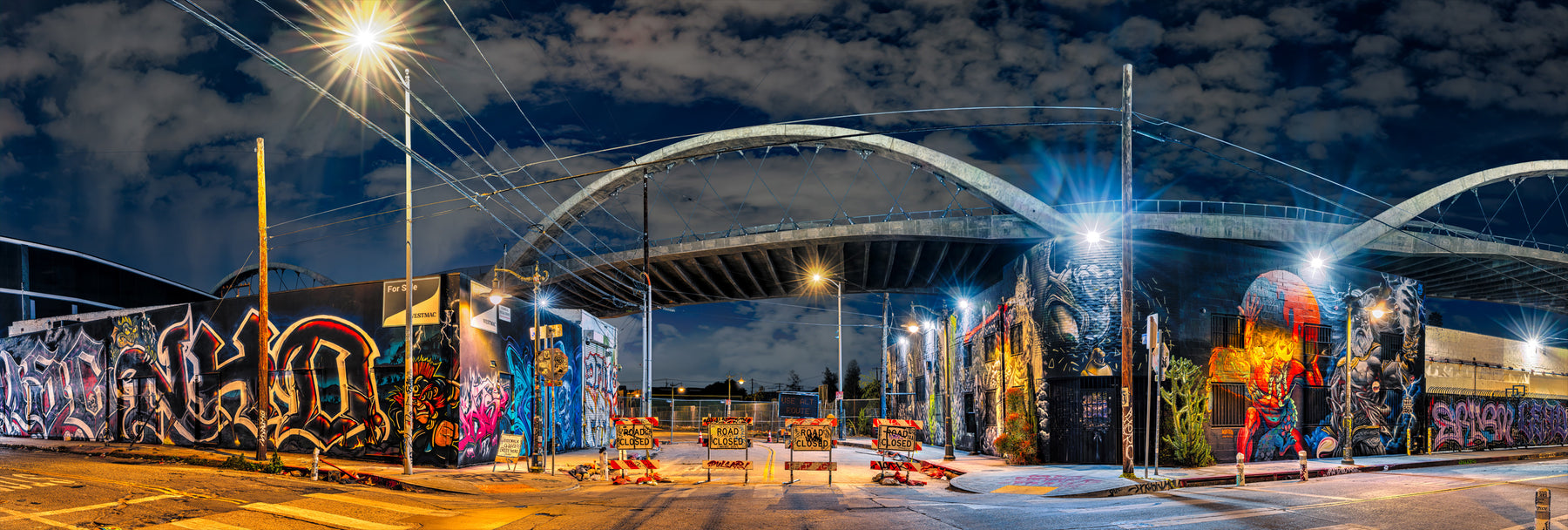 Los Angeles takes on an entirely different character after dark. As the energy of the day fades, the streets reveal bold explosions of color and expression stretched across the walls beneath sweeping concrete arches.