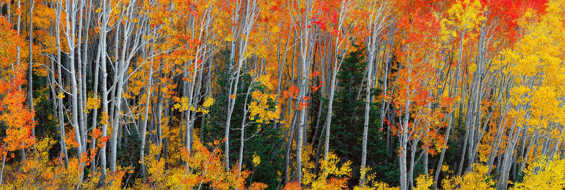 The moment this scene came together, the forest felt alive with quiet movement. Aspen trunks stood like silver sentinels, rising through a sea of fiery orange and deep green, each color marking the subtle shift between seasons. Autumn had arrived in full voice, yet traces of summer still lingered beneath the canopy, creating a rare harmony between warmth and coolness. The challenge was honoring both without allowing one to overpower the other.